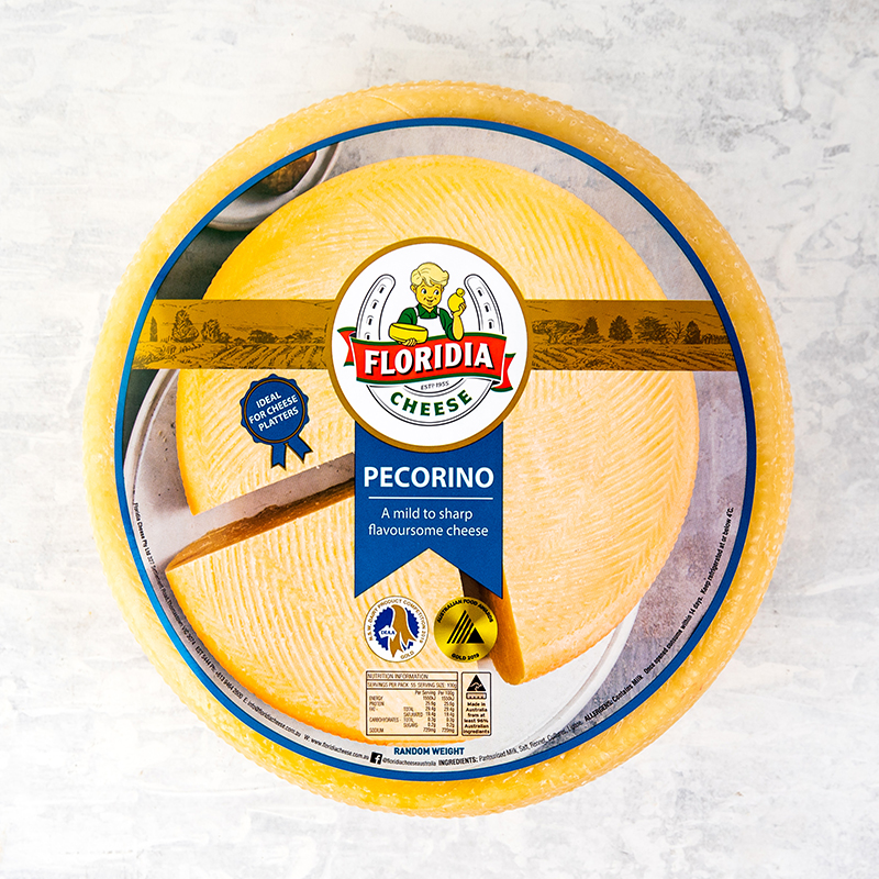 Floridia Semi-Matured Pecorino is a natural cheese manufactured from fresh pasteurized cow’s milk. This cheese is a drum-shaped wheel, firm in texture, with a hard body. Matured for a minimum period of 6 months, where it develops its characteristic flavours that range from mild to sharp. Yellow in appearance, Floridia Pecorino makes the ideal table cheese or use for grating over pasta dishes, breads and baking casseroles.